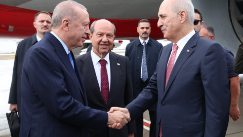 Erdoğan, Ercan Havalimanı'nda, KKTC Cumhurbaşkanı Ersin Tatar tarafından karşılandı. Karşılamada, TBMM Başkanı Numan Kurtulmuş, KKTC Cumhuriyet Meclisi Başkanı Ziya Öztürkler, KKTC Başbakanı Ünal Üstel ve Türkiye'nin Lefkoşa Büyükelçisi Ali Murat Başçeri de yer aldı. Cumhurbaşkanı Erdoğan ile Dışişleri Bakanı Hakan Fidan, Sağlık Bakanı Kemal Memişoğlu, Gençlik ve Spor Bakanı Osman Aşkın Bak, Ticaret Bakanı Ömer Bolat, AK Parti Genel Başkan Yardımcısı ve Parti Sözcüsü Ömer Çelik, Cumhurbaşkanlığı İletişim Başkanı Fahrettin Altun ve Cumhurbaşkanı Dış Politika ve Güvenlik Başdanışmanı Akif Çağatay Kılıç da KKTC'ye geldi.