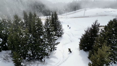 Giresun’un Kümbet Yaylası’nda kar yağışını fırsat bilen Ordu Extreme Spor Kulübü ve Sinop Surfing ekibi sporcuları, 2250 rakımlı Koçkayası mevkisinde ladin ağaçlarının arasında snowboard yaptı.