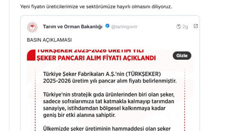 Bakanlığın sosyal medya hesabından yapılan açıklamada, "TÜRKŞEKER 2025-2026 üretim yılı şeker pancarı alım fiyatı güncellendi. Bu kapsamda, kota tamamlama primi ile birlikte şeker pancarı alım fiyatı ton başına 3 bin 100 TL olacaktır. Yeni fiyatın üreticilerimize ve sektörümüze hayırlı olmasını diliyoruz” denildi.