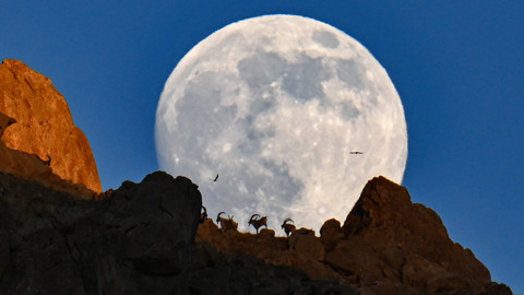 Van'ın Gürpınar ilçesinde nesli koruma altındaki yaban keçileri, dağın arkasından yükselen dolunayla birlikte görüntülendi.