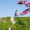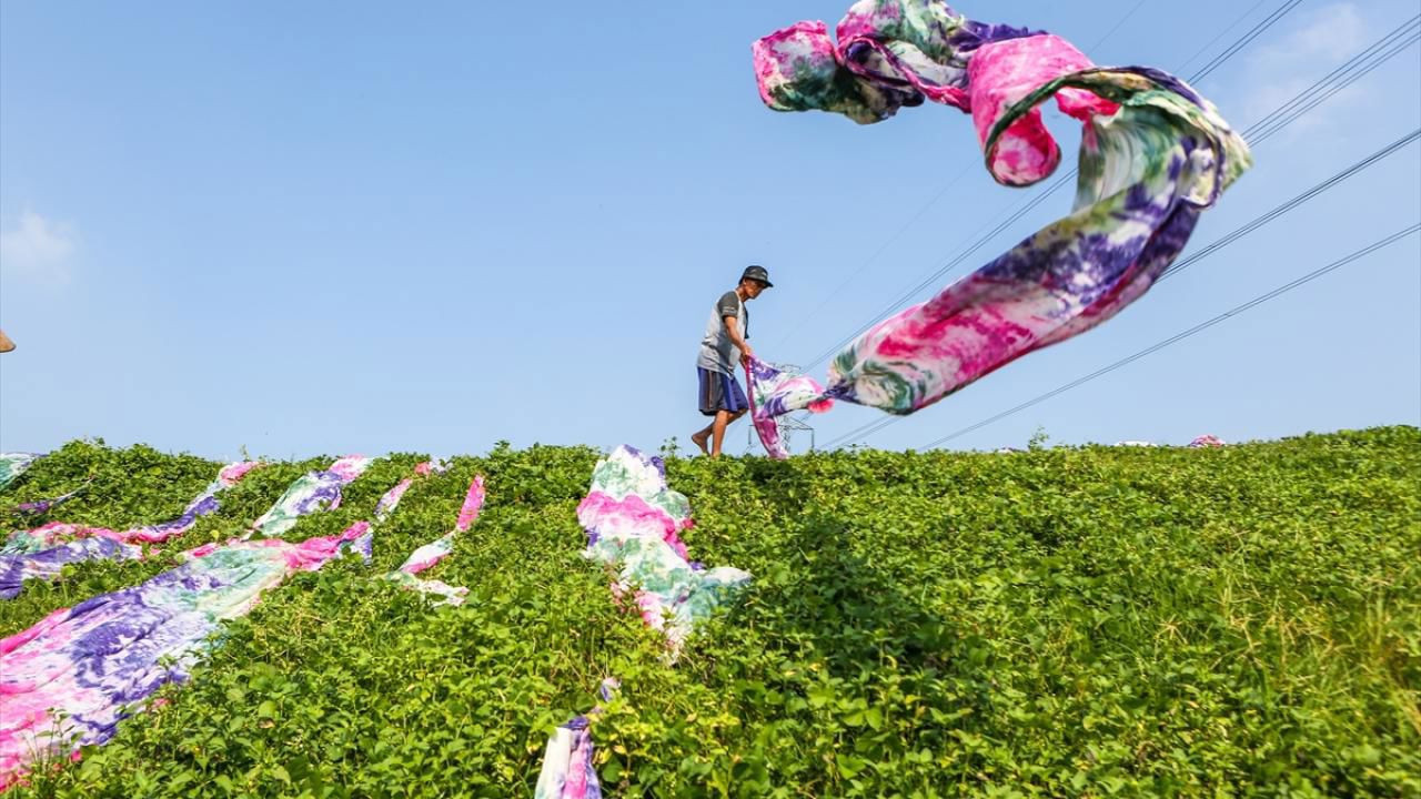 Tekstil işçileri, batik kumaşları boyama işleminin ardından doğal yöntemlerle kurutuyor.