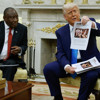 Görüşmede Güney Afrika'da beyaz çiftçilere yönelik şiddet olaylarını "soykırım" olarak tanımlayan Trump, ekran görüntülerinin çıktısını kameralara göstermiş ve "Bunların hepsi gömülen beyaz çiftçiler" demişti.