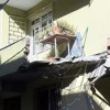 Çökme nedeniyle balkondan kopan beton parçaları sokağa düştü.