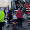 Otobüsün önünde sıkışan muavin Semih Engin Çamur, itfaiye ekiplerince bulunduğu yerden kurtarıldı.